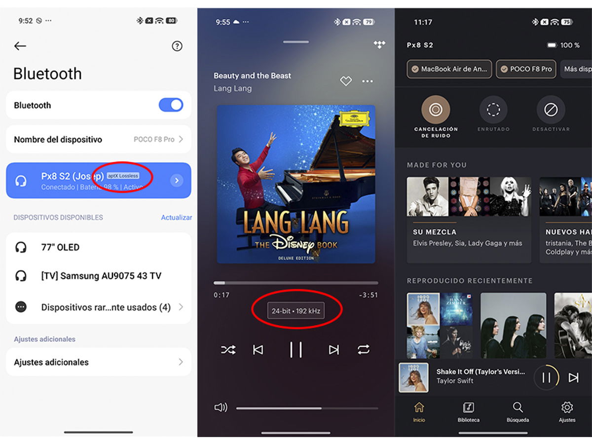 Y ahora entremos en detalle. Primero los conecté a mi iPhone, ya que es el móvil que utilizo en el día a día. Se escuchaban espectacular, pero sabía que podía sacarles mucho más, ya que, como he comentado, los Px8 S2 son compatibles con aptX Lossless, aptX Adaptive y aptX HD. Por suerte, tenía en casa un móvil Android que estoy probando que, casualmente, es compatible con aptX Lossless, pudiendo reproducir desde Tidal en 24 Bit 192 kHz. ¡Y wow, menudo espectáculo!