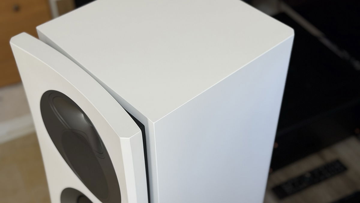 Tras el impacto inicial (y el dolor de espalda para manejar y colocar estos altavoces), empecé a apreciar los detalles del diseño de los Arendal Sound 1528. Más allá de la anécdota, este excesivo peso tiene su por qué. Estamos ante unos altavoces tremendamente robustos y con un nivel de acabados súper premium. Están disponibles en dos acabados: una especie de gris oscuro muy bonito y el habitual blanco, que como podéis ver en las fotos es el que yo probé. Precioso. Tienen un deflector frontal curvado de 85 mm de grosor que les da un aspecto tremendamente original y moderno, con un anillo embellecedor empotrado que crea una sutil línea de sombra que separa los altavoces del gabinete.