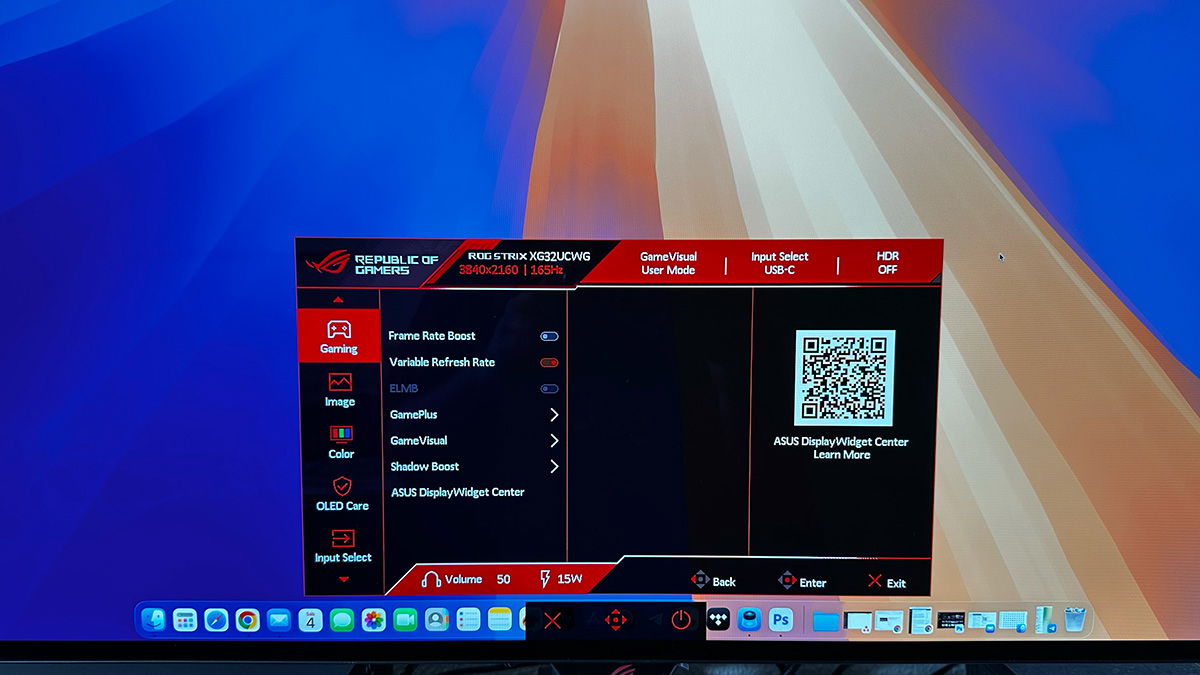 El sistema de menús del Asus ROG Strix OLED XG32UCWG se controla mediante el joystick que tenemos oculto tras el logotipo de ROG en el bisel inferior. El OSD es bastante completo y ofrece una navegación sencilla y fácil de seguir. También se puede usar, como alternativa, el Centro de Widgets de Asus para controlar la configuración del monitor, compatible con Windows y macOS.