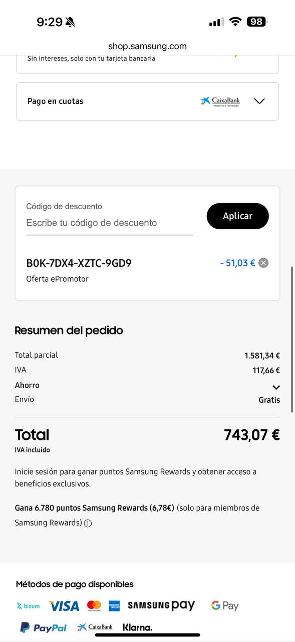 Bien al haberle dado al botón, os llevará a la web de Samsung donde debéis añadirla al carrito. Una vez hecho, le daremos al icono del agente del chat que tenéis abajo a la derecha -insisto: quitad los bloqueadores de publicidad o podríais no verlo-, tiene la fotografía de un hombre. Tras poner nuestros datos y pinchar donde pone que estás interesado en productos de AV, le pediremos un cupón de descuento. Lo apuntamos y finalmente nos vamos al carrito (arriba a la derecha) donde lo introduciremos, quedándose en un precio de 743 euros.