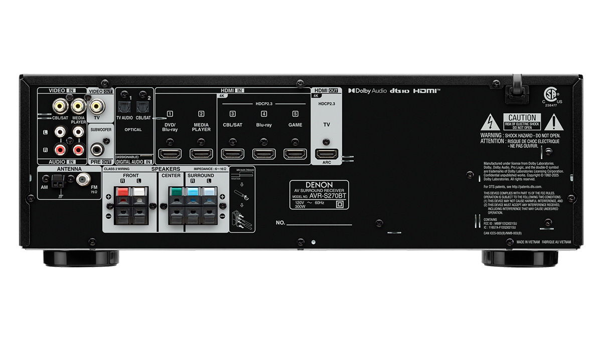 En cuanto a amplificación, el Denon AVR-S270BT ofrece hasta 70 W por canal a 8 ohmios (20Hz–20kHz, THD 0.08%) o 90 W por canal a 6 ohmios (1 kHz, 0,7 %) con 2 canales activados, así que con los cinco tendremos que tener en cuenta que la potencia será inferior (como suele ser habitual).