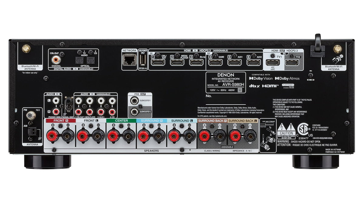 Más allá de los conectores HDMI, el AVR-S980H cuenta con dos entradas ópticas, una coaxial, una entrada de fono MM y cuatro entradas analógicas. Además incluye las dos comentadas salidas para subwoofer, así como los terminales para los altavoces claro. A nivel inalámbrico, cuenta con AirPlay 2, Wi-Fi y Bluetooth. Además es compatible con Alexa, Google Assistant y Siri para un funcionamiento con manos libres.
