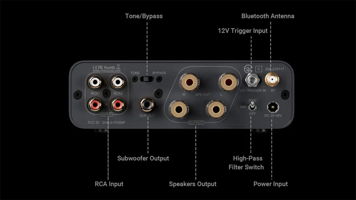 En cuanto a la conectividad por cable, incorpora dos juegos de entradas RCA para poder conectar nuestras fuentes. También tiene los bornes para los altavoces, una entrada 12V Trigger y una salida para subwoofer, la cual nos permitirá crear fácilmente un sistema 2.1. Y hablando de eso, el amplificador permite un ajuste del HPF con dos opciones: salida de rango completo de 20 Hz a 20 kHz y un filtro de paso alto de 80 Hz a 20 kHz.
