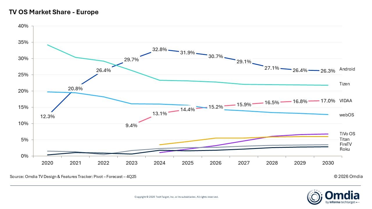 Lo contrario ocurre con Roku OS y Fire TV de Amazon tienen una presencia mínima en Europa, a pesar de ser los sistemas operativos de televisión líderes en Norteamérica. Sin embargo, los datos solo abarcan Smart TVs, por lo que se excluyen los reproductores multimedia y los sticks. Como resultado, Fire TV y Google TV están algo infrarrepresentados, mientras que tvOS de Apple no se incluye al no existir un televisor con este sistema.