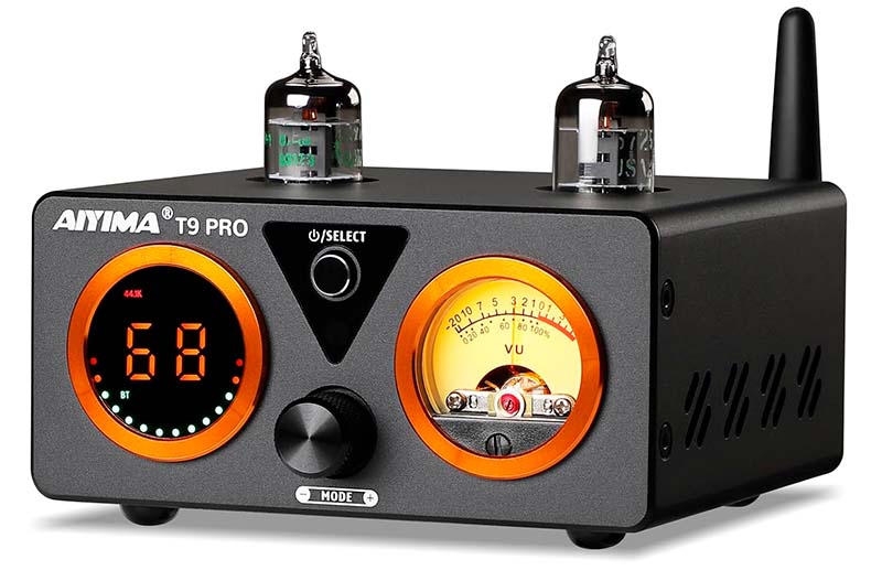 El AIYIMA T9 PRO no solo suena bien, también destaca allá donde se coloca. Su pantalla digital redonda, con marco en tono cobre y números LED rojos, se complementa con puntos verdes que aportan un toque elegante sobre fondo negro. Además, incorpora detalles como ribetes dorados y luces espectrales que realzan su presencia en cualquier espacio. Todo ello se combina con un panel frontal que integra medidores analógicos retroiluminados en naranja, selector de modo y controles intuitivos para volumen, tono y silencio.