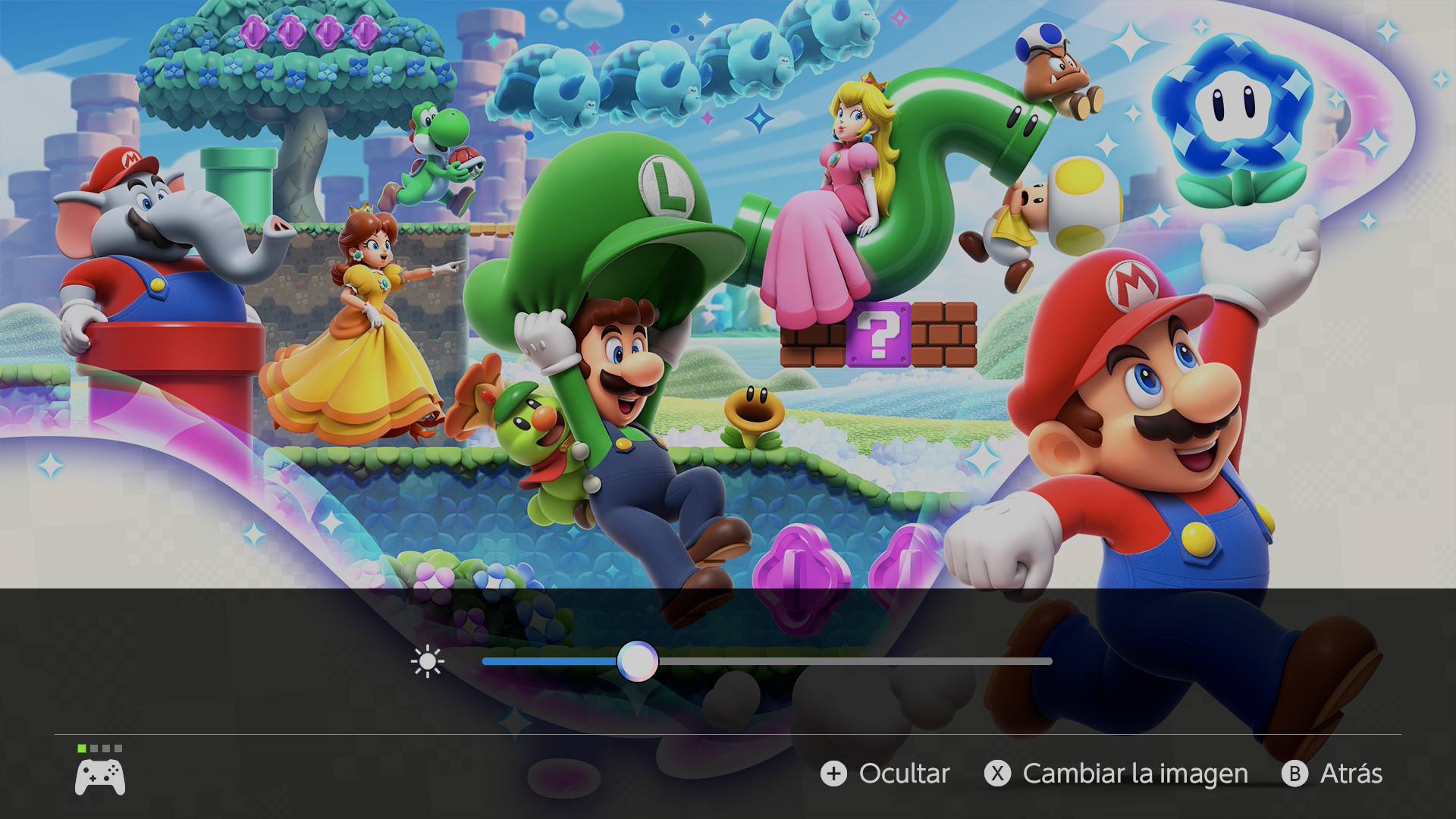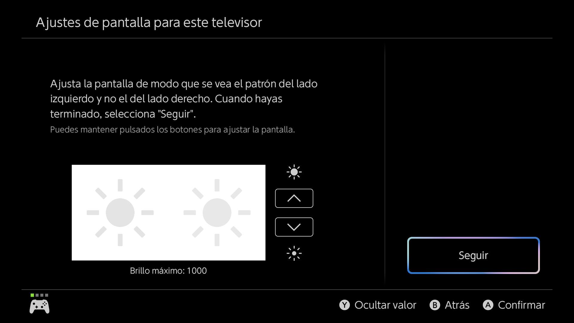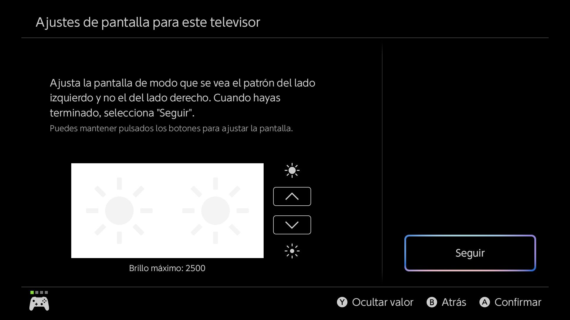Ahora pulsaremos sobre Ajustes del HDR, donde nos aparecerá ya el primer asistente de luminosidad del HDR. En esta actualización, Nintendo ha puesto el número de nits en pantalla, por lo que es una ayuda perfecta para comprobar que todo está bien. Lo primero de todo aquí es darle para abajo a tope, hasta que no nos deje más. Y de ahí ir subiendo hacia arriba los clicks necesarios hasta que lleguemos a los nits de nuestro televisor (2500 en este ejemplo al ser una LG OLED G5. Si lo hemos hecho bien, también veremos el sol desaparecer justo por un click (no os fijéis en la captura, es solo a modo de ejemplo):