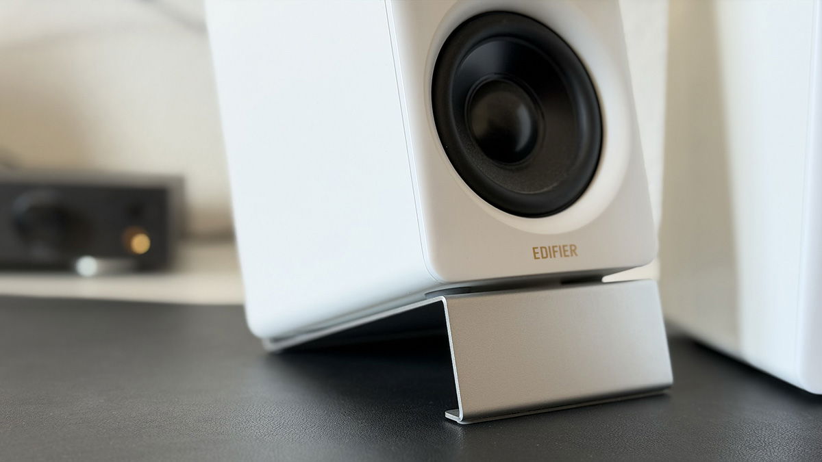 Los drivers están a la vista, no tenemos rejillas de protección. Lo que sí viene en el paquete es un soporte metálico que levanta el altavoz unos 15 grados, lo cual deja claro que están totalmente pensados para funcionar en un escritorio junto a un ordenador. Esta pequeña base de aluminio ayuda a asegurar que los altavoces tengan el ángulo correcto para ofrecer el mejor rendimiento posible.
