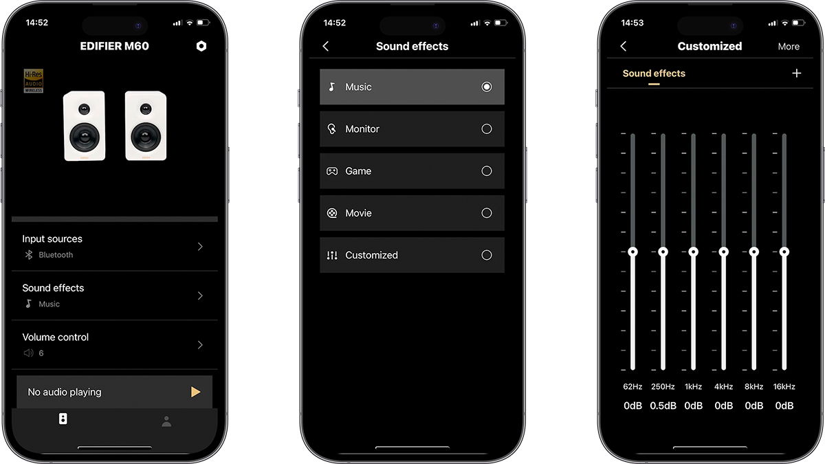 Más allá de los controles táctiles, los M60 son compatibles con la aplicación ConneX de Edifier. Como es lógico, se conectan a la aplicación mediante el Bluetooth, ya que no tienen WiFi. Pero aún así, Edifier les ha dotado de muchas funciones interesantes. Por ejemplo, incluye un ecualizador personalizado de 6 bandas, con varios ajustes predefinidos. Personalmente he utilizado todo el tiempo el modo «Music», que me ha gustado bastante.