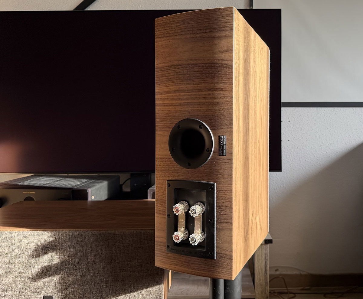 Por último, el Dali Rubikore Cinema cuenta con un puerto bass reflex trasero y dos juegos de terminales para altavoces de muchísima calidad, con puentes suministrados de fábrica. Estos puentes se pueden quitar para permitir la conexión bicableada si así lo deseamos.