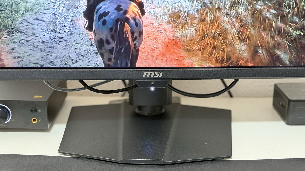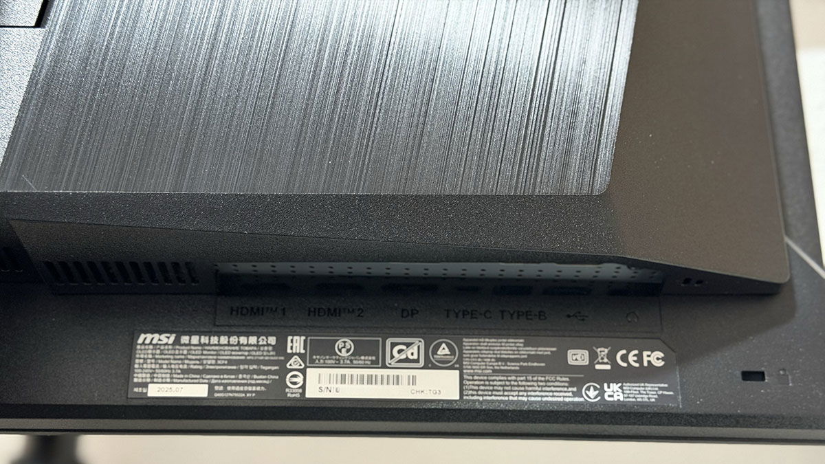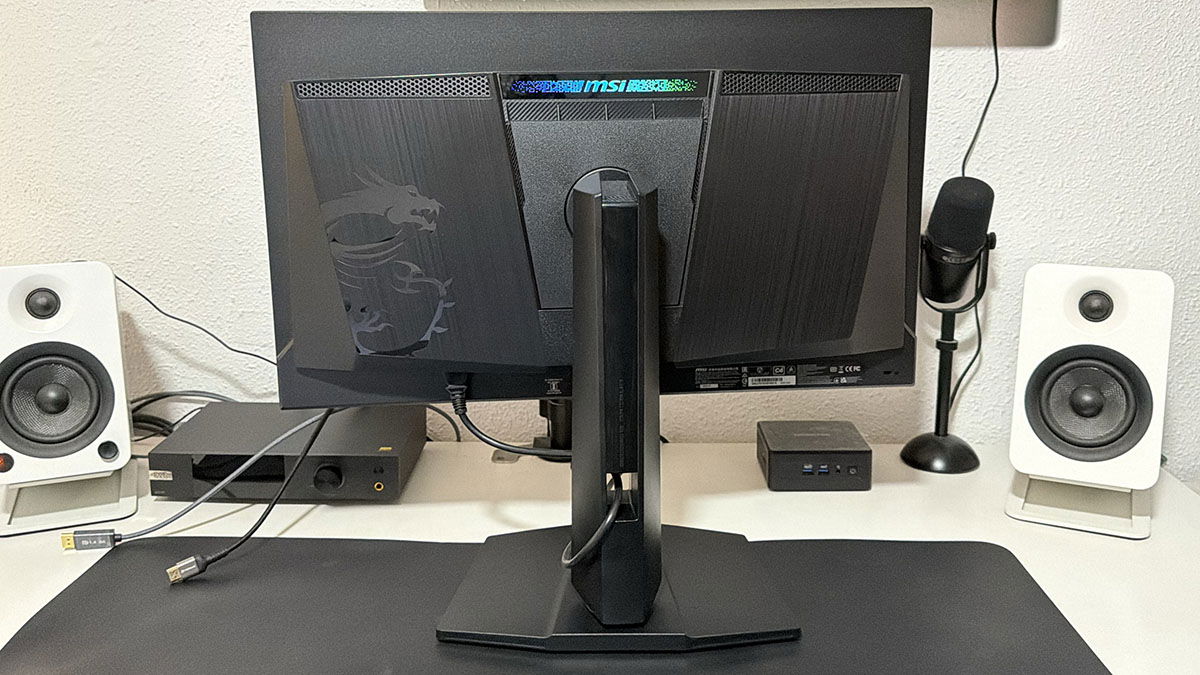 Y ya que hemos vuelto a la parte trasera, hablemos de la conectividad. Todo los puertos están colocados en posición inferior, lo cual siempre me ha parecido más incómodo que la posición lateral. Sin embargo, entiendo que para colgar el monitor en la pared o en un brazo es mejor (es compatible con VESA 100×100). Más concretamente el MPG 271QR QD-OLED X50 cuenta con dos entradas HDMI 2.1, un DisplayPort 2.1a y un USB-C con DP Alt Mode. Este último además cuenta con PD de hasta 98 W, suficiente para la gran mayoría de portátiles actuales.