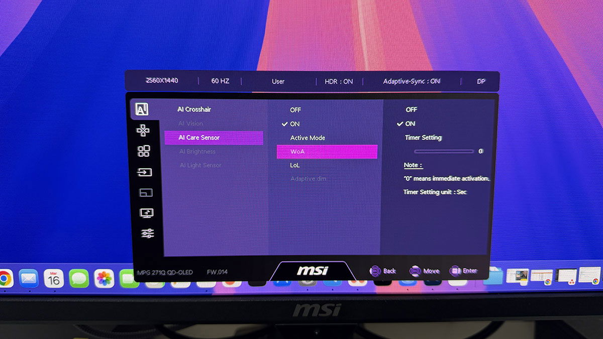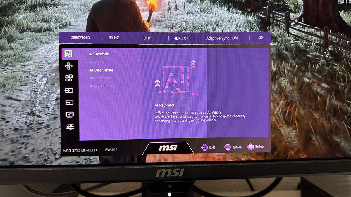 Pero la función realmente novedosa del MPG 271QR QD-OLED X50 es sin duda el AI Care Sensor. Esta tecnología utiliza un sensor CMOS para detectar imágenes cada 0,2 segundos y, gracias a un chip de IA con un algoritmo NPU, identificar la presencia humana para evitar falsas detecciones y apagados involuntarios de la pantalla. Es decir, se utiliza la unidad de procesamiento neuronal para distinguir entre personas y objetos, lo que permite una gestión más inteligente de la energía.