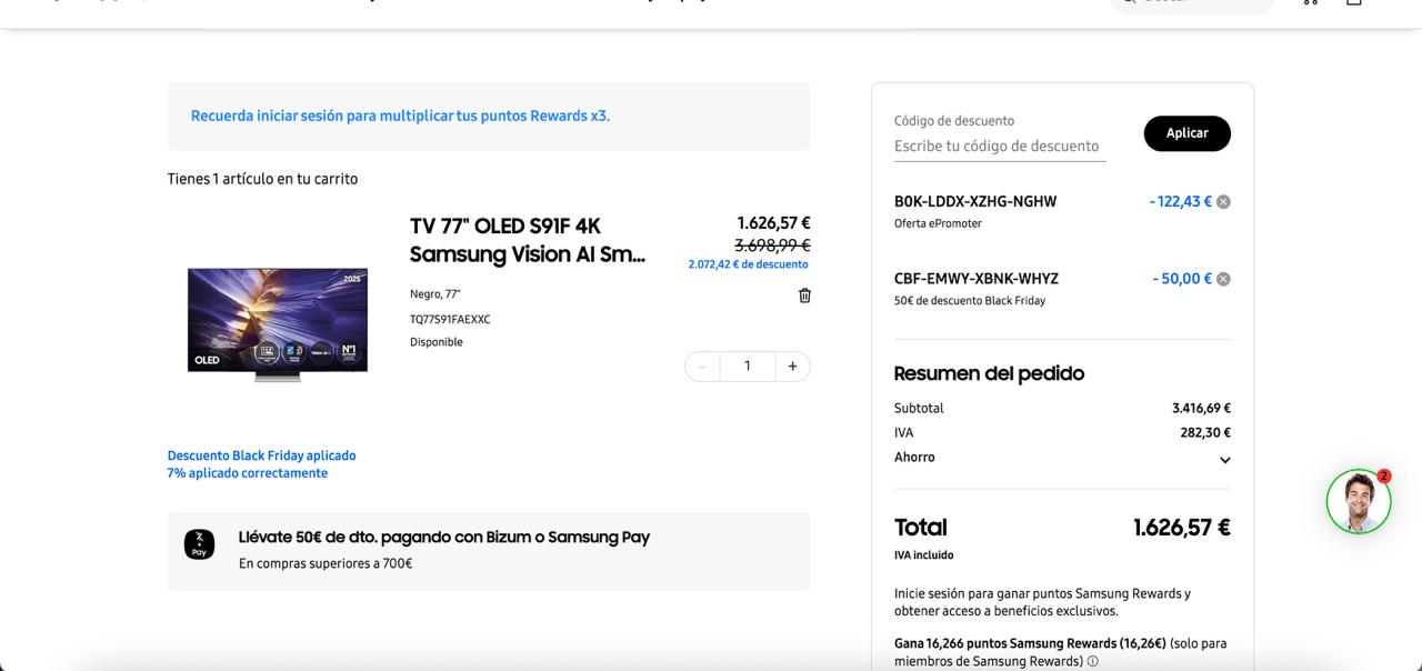 Bien al haberle dado al botón, os llevará a la web de Samsung donde debéis añadirla al carrito. Una vez hecho, le daremos al icono del agente del chat que tenéis abajo a la derecha -insisto: quitad los bloqueadores de publicidad o podríais no verlo-, tiene la fotografía de un hombre. Tras poner nuestros datos y pinchar donde pone que estás interesado en productos de AV, le pediremos un cupón de descuento. Nos dará uno del 7% y otro de 50 euros si nuestra compra supera los 700 euros (que lo supera).