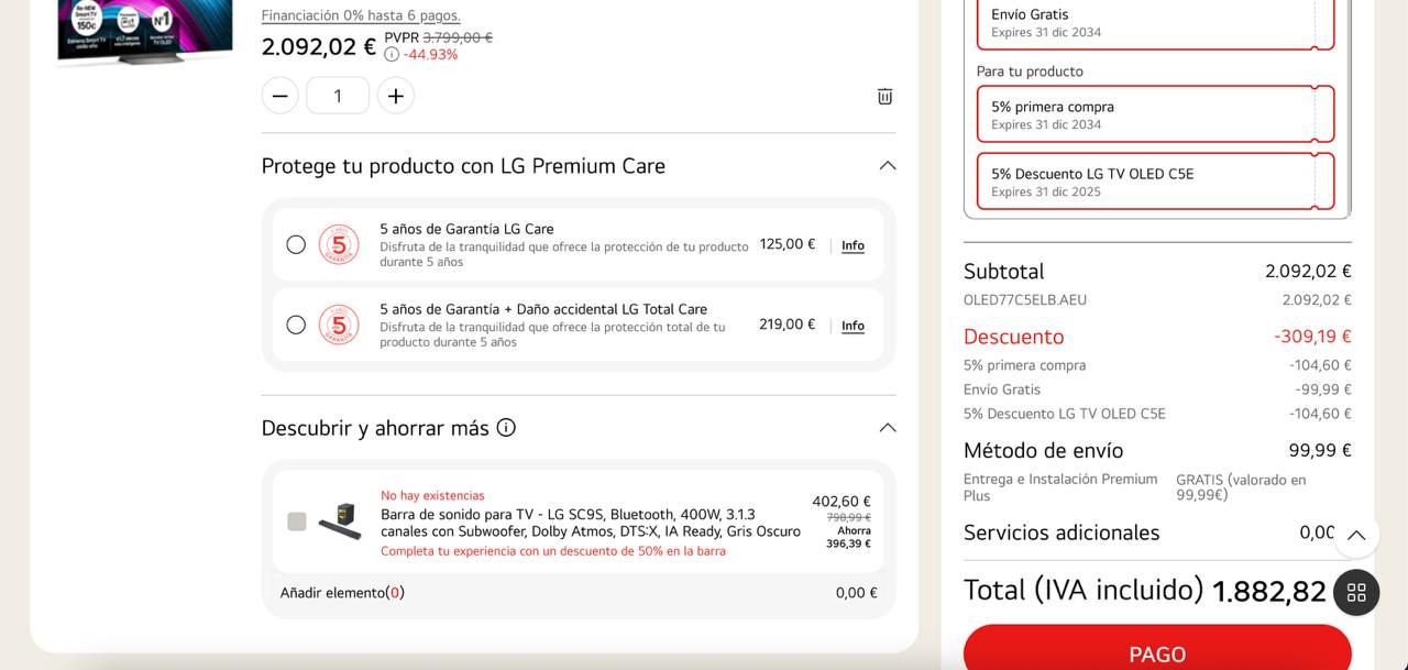Y listo, con todo eso hecho ya tendremos el precio final que en este caso es de 1882 euros a los que habrá que descontarle el cashback o reembolso de 300 euros, con los que se quedará el televisor al precio tan brutal y sorprendente como real de 1582 euros. Y sobre el cashback, si, LG nos ingresará el dinero tras enviarles la documentación, normalmente lo hacen al cabo de 1 o 2 meses.