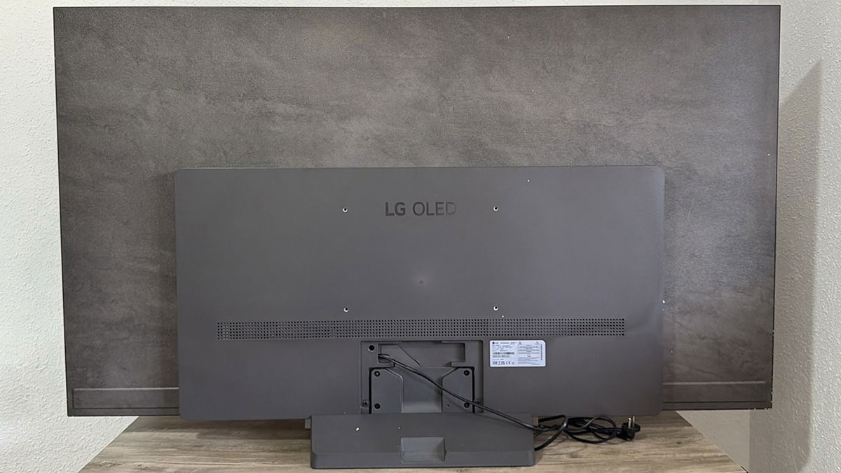 Volviendo a la trasera, tenemos el comentado acabado «tipo piedra» que le da un toque interesante. Todo el televisor es bastante delgado, pero en la parte central tenemos una zona más gruesa que esconde la electrónica. Es lo habitual desde hace muchos años en los modelos OLED, pero debo decir que la zona «gruesa» de este C5 es mucho más delgada de lo que esperaba.