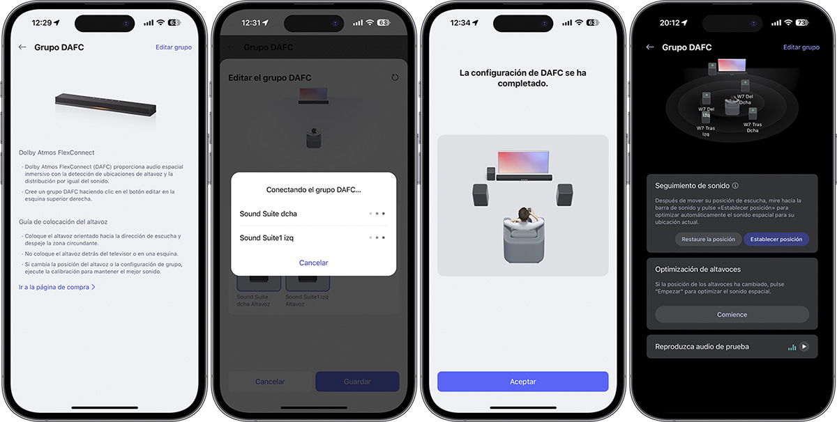 Es decir, será dentro del apartado DAFC (así lo llama LG para abreviar) donde vamos a poder configurar el sistema Atmos FlexConnect. En realidad, si ya hemos conseguido conectar correctamente a la red todos los altavoces que tengamos, la configuración es bastante rápida. El sistema evalúa la posición de los altavoces y realiza un mapeo de la sala para ver dónde está colocado cada uno de los altavoces.