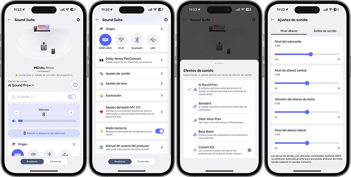 Una vez completada la configuración del sistema, me ha gustado que dentro de la aplicación permite ajustar individualmente los niveles del subwoofer, el altavoz central, los altavoces superiores y los canales laterales. También tenemos un ajuste de tono independiente que permite modificar por separado los niveles de agudos, medios y graves. Y una función interesante es Ajustar posición, la cual utiliza la tecnología FlexConnect para redirigir el campo sonoro hacia una posición de escucha diferente con solo pulsar un botón. Por si un día nos apetece sentarnos en otros sofá.