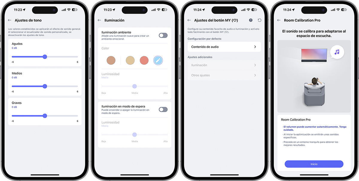 La aplicación nos permite mucho más que cambiar entre modos. Podemos saltar entre entradas (HDMI, WiFi, Bluetooth, USB), ajustar la iluminación de la que hemos hablado antes, cambiar la configuración del botón de favorito y también activar y desactivar el Modo nocturno. Y por supuesto podemos controlar todo lo relacionado con el sistema Dolby Atmos FlexConnect y la calibración del mismo.