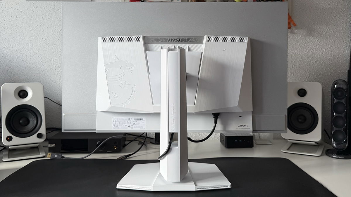 Como ya es habitual en la mayoría de monitores, el MSI MPG 321URXW viene con un sistema de montaje súper sencillo. Simplemente ponemos la base con un tornillo de mariposa que se puede apretar con la mano y «conectamos» el brazo a la parte trasera del monitor con un «click», es decir, sin herramientas. Rápida y al mismo tiempo muy seguro. Lógicamente la característica más distintiva de este modelo es su acabado en blanco con toques plateados en la parte posterior del panel.