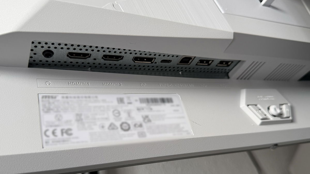 El joystick para manejar el menú OSD está justo en el centro del monitor y a los lados del mismo tenemos todos los conectores, colocados en posición inferior. El MSI MPG 321URXW cuenta con dos puertos HDMI 2.1, un DisplayPort 1.4a, un USB-B, un USB-C, dos USB 2.0 y una toma de audio de 3.5 mm. El puerto USB-C ofrece 90W de PD y además podemos usar tanto el USB-C como el USB-B como conmutador KVM. El monitor no incorpora altavoces.