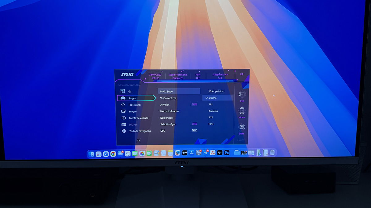 Y por supuesto no me olvido del gran «debe» de los monitores con tecnología OLED: el brillo. MSI declara un brillo de 250 nits en SDR y 450 nits de brillo típico en HDR y en ventana del 10%, pudiendo alcanzar picos de 1000 nits al 3%. Son valores muy cercanos a la realidad, así que se quedan bastante lejos de tecnologías como el MiniLED. Pero aún así, el brillo es más que aceptable y al combinarlo con el contraste infinito de la tecnología OLED rara vez echaremos en falta un brillo superior, especialmente si solemos usar el monitor en una sala oscura.