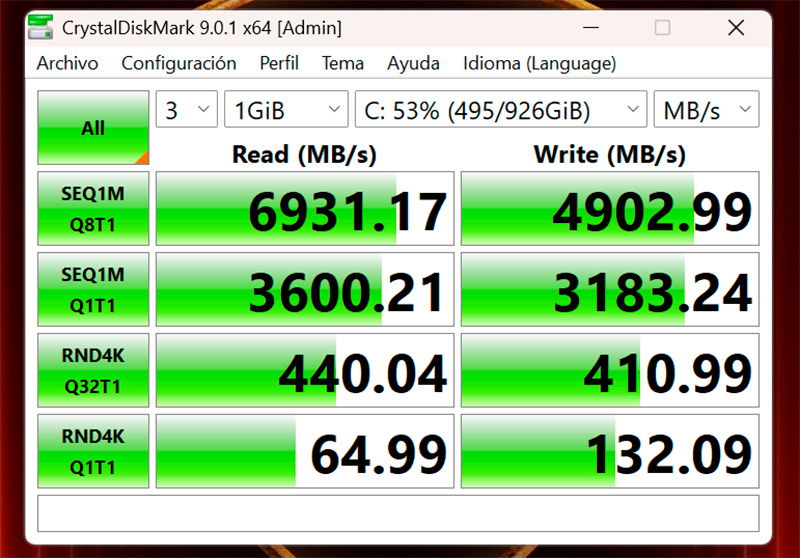 Como podéis ver, el rendimiento del almacenamiento SSD NVMe PCIe Gen4 x4 es realmente alto, con una velocidad de lectura de casi 7000 MB/s y casi 5000 MB/s en escritura, un cañón. Es cierto que quizás para el precio del portátil 1 GB creo que es una capacidad demasiado ajustada.