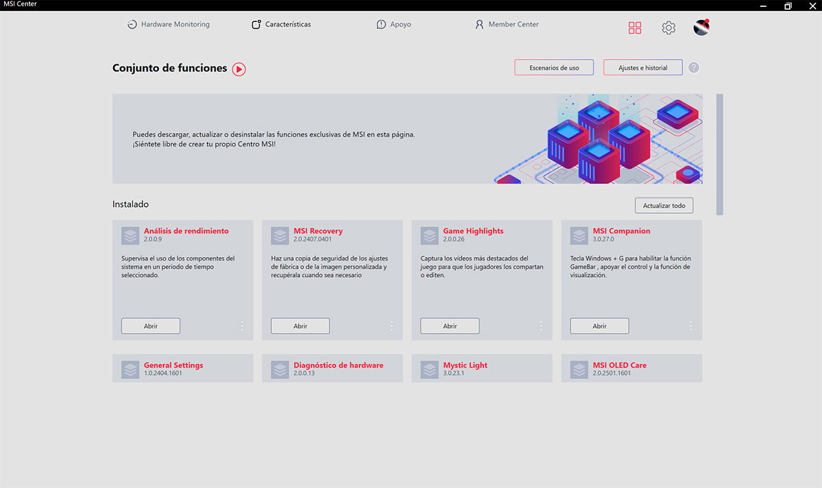 Y en lo que respecta al software, el Stealth A16 AI+ viene con el molesto Norton instalado y también con la solución MSI Center del fabricante. Desde esta última podemos realizar los ajustes más importantes del ordenador, como por ejemplo las opciones de MSI OLED Care, la solución del fabricante para cuidar el panel OLED. También nos proporciona acceso a Mystic Light y al MSI AI Engine.