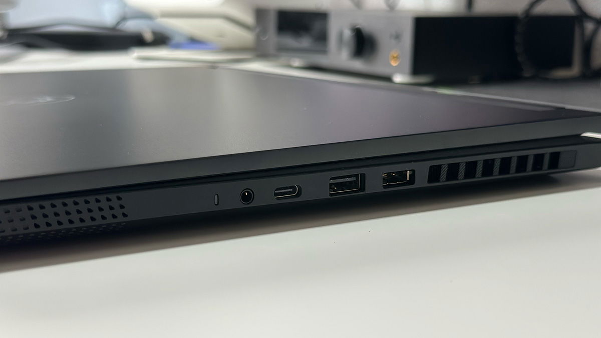 Al ser alargadas no impactan en el grosor del dispositivo, pero sí hacen que los conectores estén un poco «apretados». Hablando de conectores, en el lateral derecho tenemos el conector de la fuente de alimentación de 240W, un puerto USB-A 3.2 Gen2 y un puerto USB-C de tipo USB4 compatible con Thunderbolt 4, DisplayPort y PD 3.0; además de un jack de audio combo.