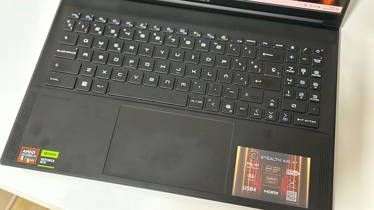 Para conseguir estos números el Stealth A16 AI+ utiliza un chasis de aleación de magnesio y aluminio duradero en Core Black. Es un material que ofrece un tacto muy diferente al acabado metálico de la mayoría de equipos premium, ya que parece una mezcla entre plástico y metal. Aún así, a mí personalmente me parece que tiene un buen acabado.