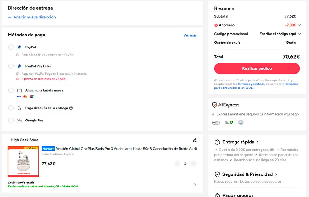 Todo esto convierte a los auriculares de los que hablamos en una opción muy completa para quienes buscan calidad, comodidad y funciones avanzadas. Y ahora, gracias a una promoción en AliExpress, es posible conseguirlos por solo 70,62 euros, frente a los 199 euros habituales, aplicando el cupón ESCD07. Se trata de la versión global, disponible en colores azul, blanco y negro, con envío gratuito incluido.