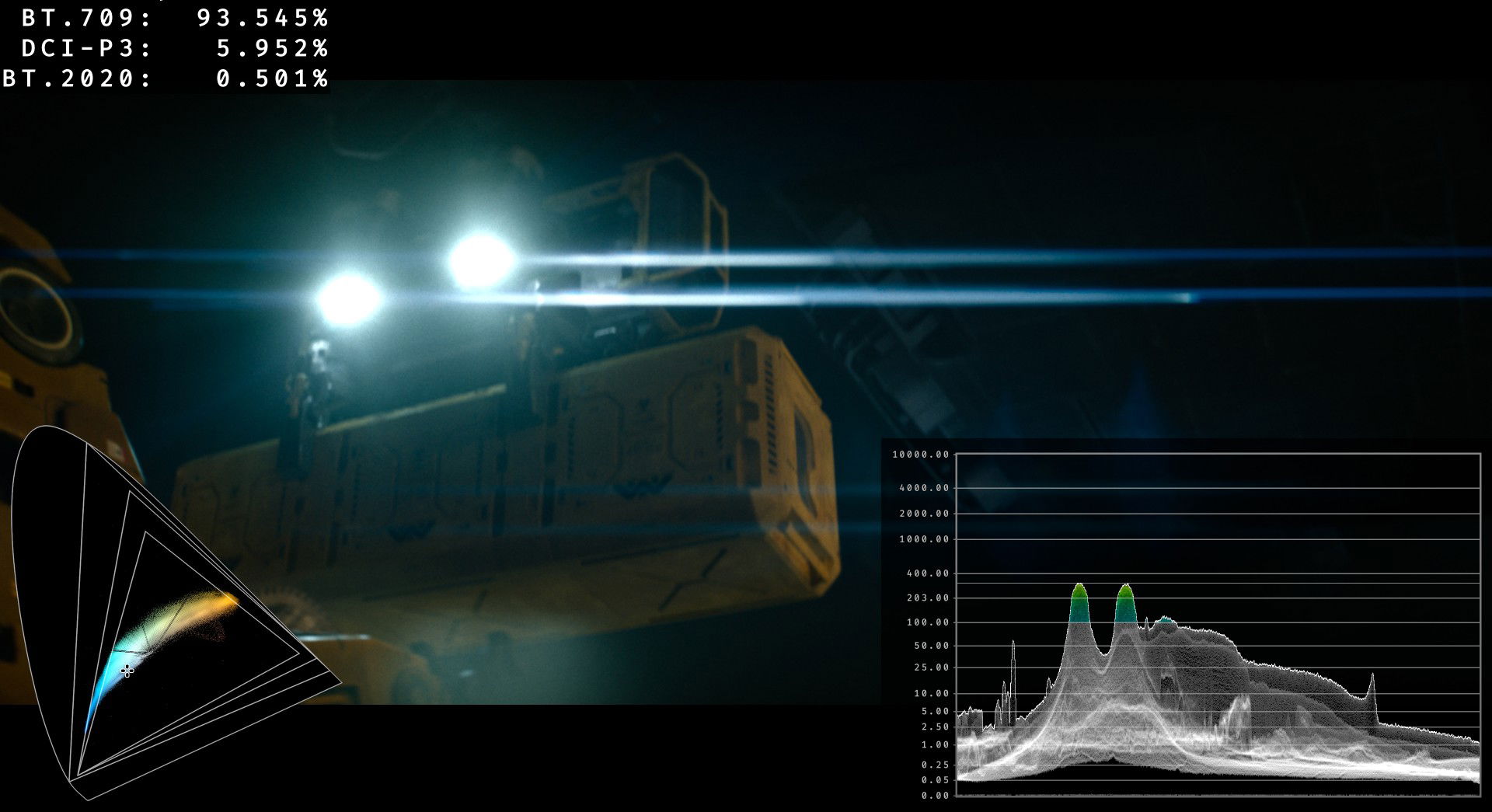 Terminamos la sección con el potente plano de la explosión HDR a 1.000 nits que antes mencionaba. Es lo más destacado, con diferencia, de este etalonaje. El volumen de color (brillo+color) es espectacular. Su receta cromática está compuesta por: