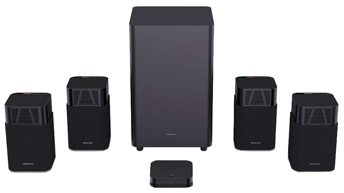 Pero vamos, con esta oferta el sistema de sonido que lleve la U8Q te va a dar lo mismo. Y es que, como decíamos, te llevas totalmente gratis el Hisense HT SATURN. ¿Qué es esto exactamente? El HT Saturn es un sistema de sonido que se compone de cuatro altavoces discretos y un subwoofer, todos conectados de manera inalámbrica a una unidad de control central.