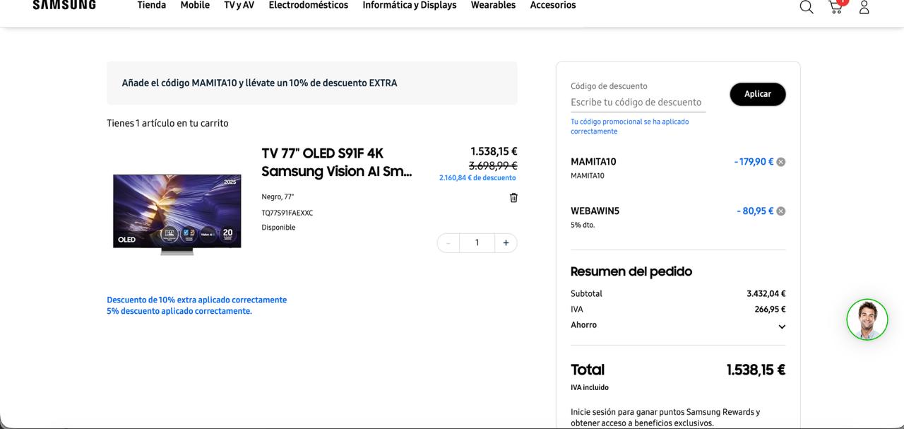 Bien, ahora la añadimos al carrito y nos dirigimos a él (arriba a la derecha), donde al darle veréis que podemos introducir cupones. Bien, pondremos los dos siguientes: MAMITA10 y WEBAWIN5 , con ellos conseguiremos automáticamente un descuento del 15%, quedando así el precio final en 1538 euros como podéis ver en la siguiente captura: