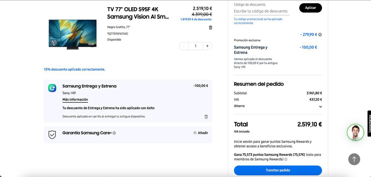 Con todo, nos toca añadir el producto al carrito. Solo tienes que hacerlo desde el siguiente botón, donde pone Ver Oferta. Ello hará que se te abra la web de la tele en Samsung España, donde deberás pulsar en Consigue 100,00 € de descuento con Samsung Entrega y Estrena (si, te hará entregar un televisor al repartidor cuando venga la nueva, pero puedes comprar cualquier modelo de 5 euros usada en Wallapop, por ejemplo) y ahora si, pulsa en Comprar (abajo a la derecha) para que se te añada al carrito.