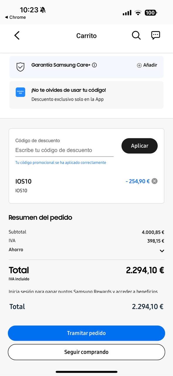 Genial, ahora si,plemente pulsaremos sobre el icono del carrito para que nos lleve hasta el resumen de la compra. Ahí, si os fijáis hay una casilla donde podemos escribir un cupón de descuento; bien, introduciremos el cupón IOS10 (la primera letra es una i mayúscula) para que nos haga un 10% de descuento (recordad que solo sirve usando la app y en un iPhone):