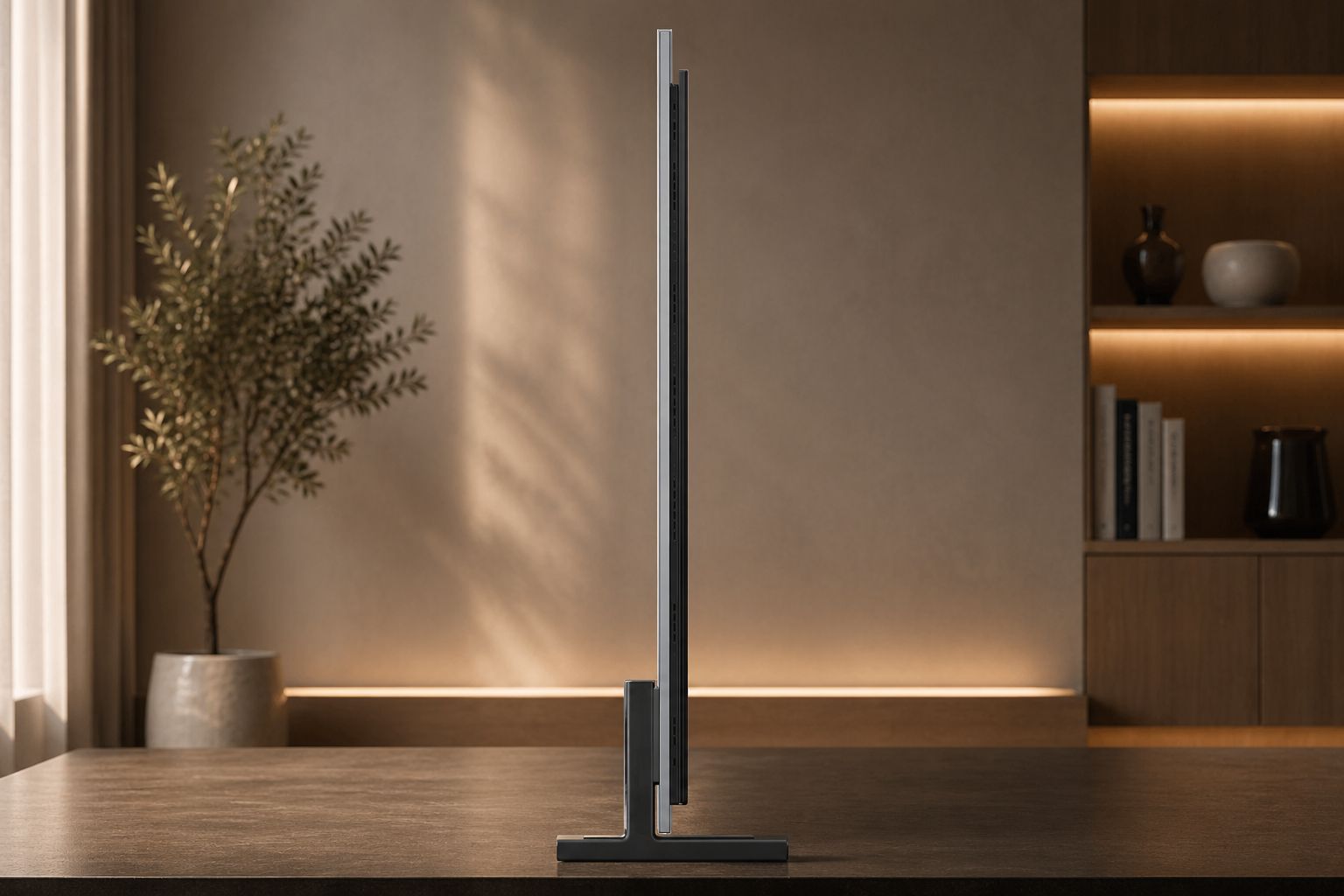Y es que cuando se anunció este modelo en el CES de 2026 a todos nos llamó la atención lo mismo al ver este televisor anunciado por Samsung: el marco extremadamente grueso y metálico que rodeaba el televisor. Como se puede ver en la fotografía de la portada, realmente no es un marco, es una especie de embellecedor trasero pegado y suspendido detrás del propio televisor (que tiene su propio marco negro extrafino) y esto tiene un motivo que veremos más abajo.