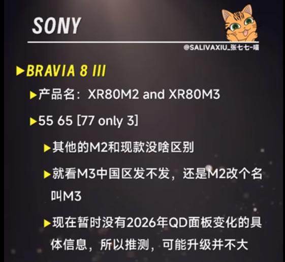 Si viestéis la noticia sobre las filtraciones de los modelos MiniLED, sabréis que la fuente es la misma: el influencer Zhang Salivaxiu, por lo que de nuevo, hablamos sobre información no oficial ni confirmada por la marca. Al margen de lo que veremos en las Mini LED, Zhang comparte la siguiente imagen donde podemos ver la nueva Bravia 8 III y algunos comentarios que hace sobre ésta: