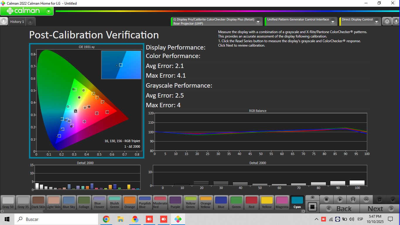 Lo primero que me llamó la atención fue ver que el color era más frío de lo normal, algo que se soluciona cambiando al modo de imagen Cine Film 1 y ajustar la opcíón de la temperatura de blanco a D65. Con ello, conseguimos una alineación RGB del balance de blancos fantástica con un AE inferior a 2.4 de media (imperceptible por el ojo humano) y una gamma que se acerca al 2.35, muy muy sorprendido de la precisión de este proyector. Lo mismo ocurre con las saturaciones de color, prácticamente clavadas.