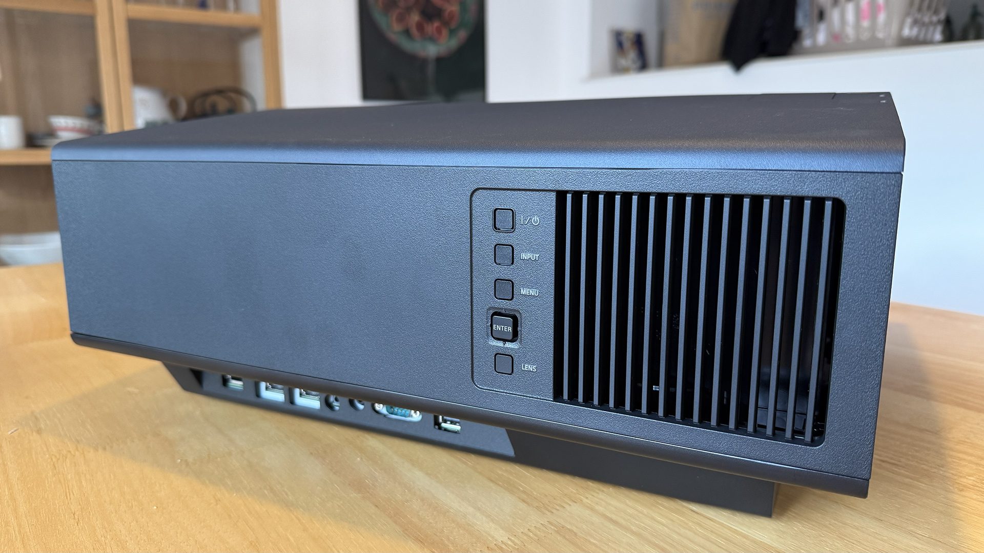 Hablando sobre las especificaciones técnicas y conectividad, lo cierto es que nos sorprendió ver los conectores en el lateral, algo que pude dificultar mucho las conexiones si tenéis el proyector colgado o montado en una manera en la que sea difícil acceder al lateral. En cualquier caso, encontramos en este VPL-XW5100ES dos puertos HDMI 2.1 completos así como un puerto minijack, un USB y puerto ethernet así como los controles manuales para manejarnos por los menús.