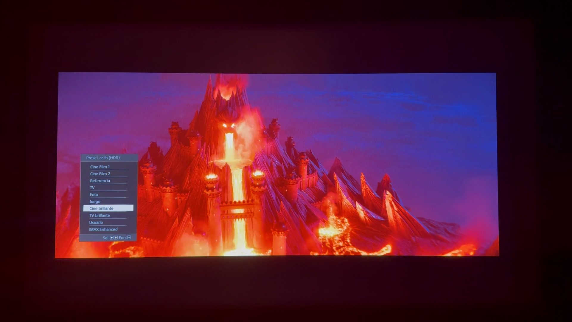 Sobre los menús de imagen, son bastante sencillos de entender -aunque en su sencillez se deja por el camino algunas opciones que nos hubiera gustado tocar a los usuarios más avanzados-. En fin, tenemos un montón de modos de imagen para seleccionar, desde Cine Film 1 y 2, Referencia, TV, Foto, Juego, Cine Brillante, TV Brillante, Usuario e IMAX Enhanced:
