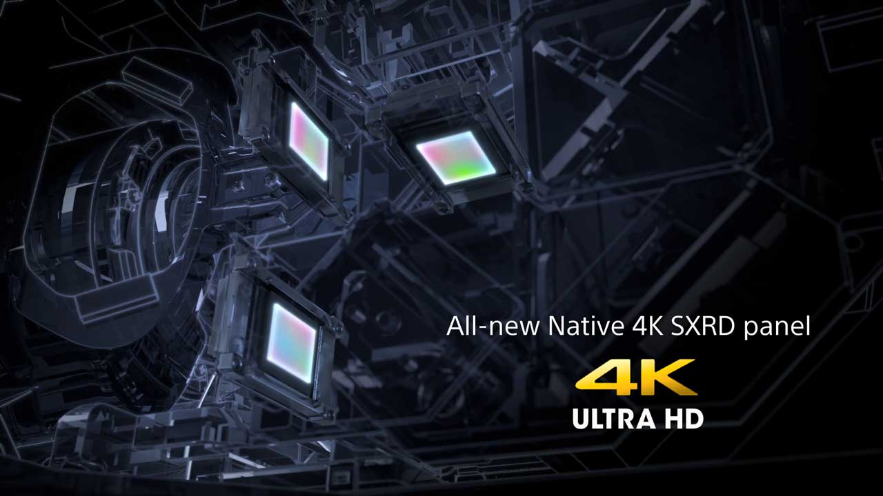 Al igual que en la otra marca japonesa, Sony usa la tecnología LCOS, basada en chips de 0.61″ transmisivos, es decir, existe una base reflectante de silicio que refleja la luz (como un espejo), ésta pasa por el panel, se modula según la imagen y se refleja hacia el objetivo del proyector. Con ello se consigue un muy mejorado contraste, niveles de negro y mayor densidad de píxeles, siendo éste un proyector 4K nativo real. ¿El precio a pagar? un mayor coste de fabricación y venta y una menor luminosidad que los modelos DLP.