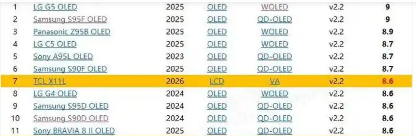Y es que como reza el subtitular, efectivamente, si nos vamos a RTINGS y ordenamos todos los televisores analizados por su puntuación global, podemos ver como la nueva X11L se queda en séptima posición, pero sorprender ver que es la primera Smart TV que no usa tecnología OLED que entra en el TOP10; además lo hace por todo lo alto por encima de otros modelos OLED como las Samsung S95C y S95D o la LG OLED G4, sin ir más lejos: