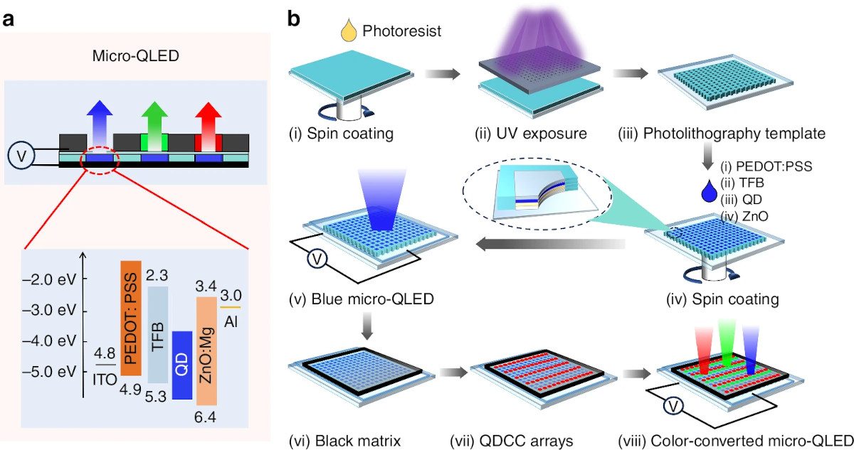 Según informa el portal Quantumdots-info, un grupo de investigadores del Instituto de Tecnología de Beijing junto con colegas de la Universidad de Beihang han desarrollado un nuevo método para fabricar paneles QL-ED de color convertido mediante fabricación fotolitográfica, lo que aumenta exponencialmente sus propiedades.