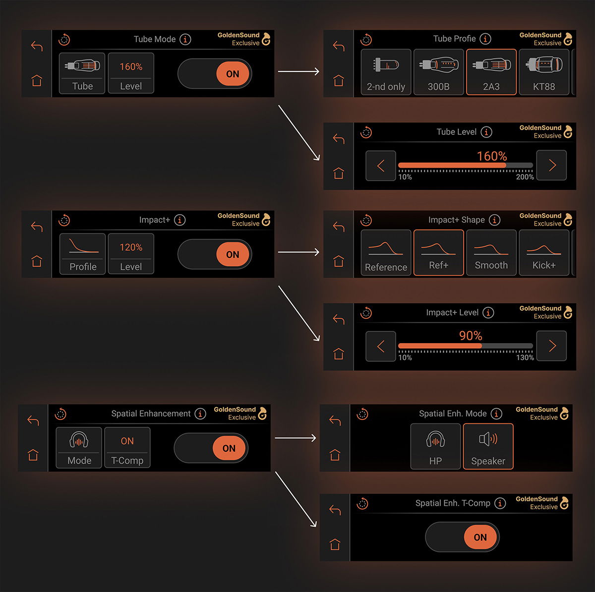 En lugar de una única mejora fija, el usuario puede ahora seleccionar el perfil que mejor se adapte a su sistema y ajustar el nivel general de Impact+ del 10% al 130%. Esto permite ajustar con precisión el equilibrio entre un refuerzo sutil y una respuesta de graves más pronunciada.